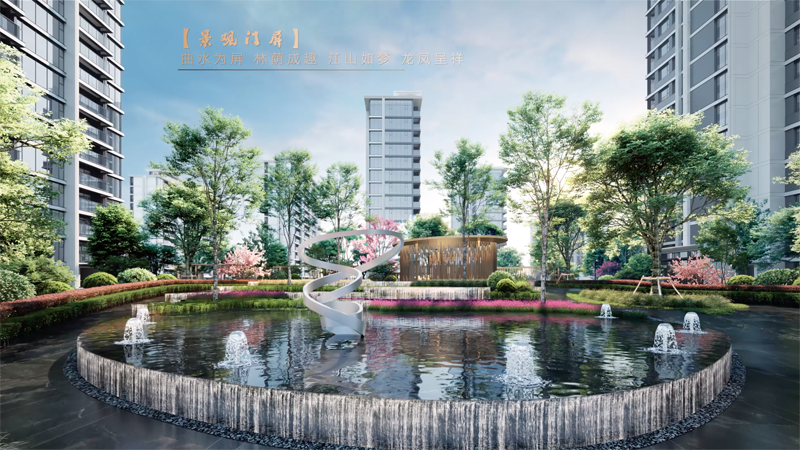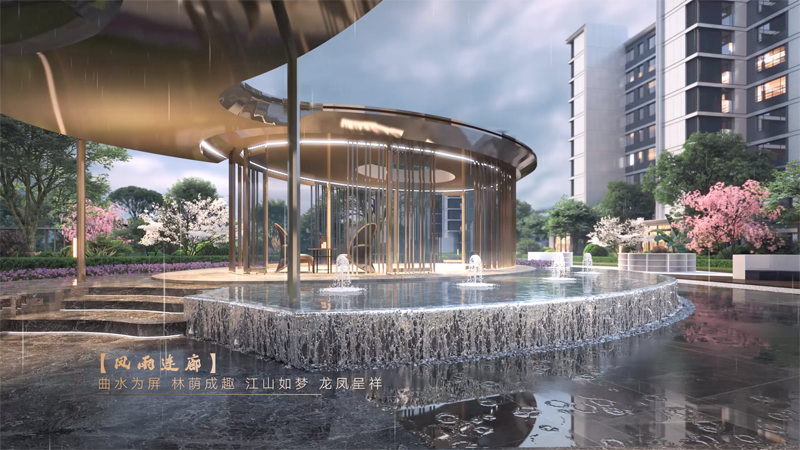 迎賓水景配以噴泉景觀以裝飾,將鏡面水景加以藝術(shù)表達(dá),形成龍鳳呈祥之勢,門庭若水定財源不絕,整體大氣、恢弘,具有儀式感。