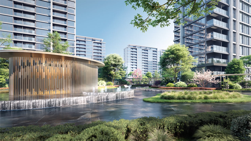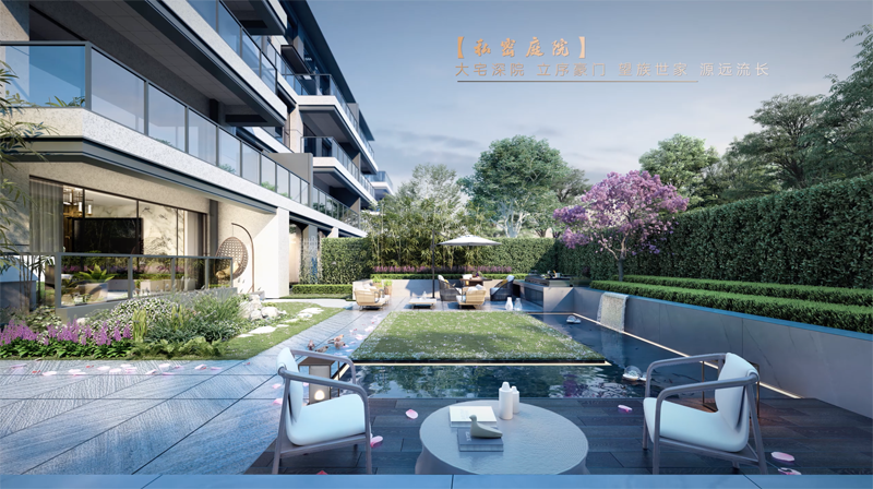 入口處隱約可見的水幕溪流景觀演繹家族的門風(fēng)禮贊;龍曲水景倒影綠林,光影縱橫潑墨如畫,營造從大門到宅邸的遞進式體驗。