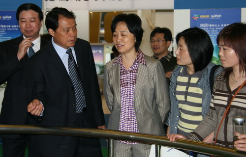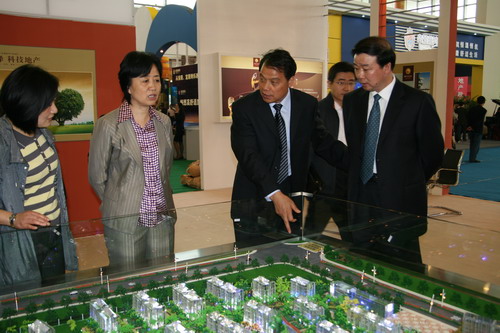 圖為董事長包廣林向常務(wù)副市長張京霞(左二)匯報陽光美第的建設(shè)情況