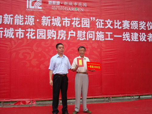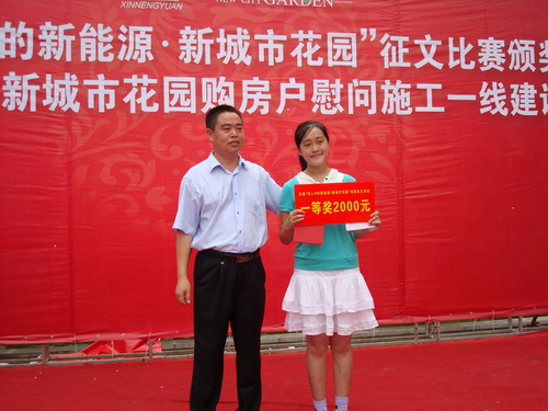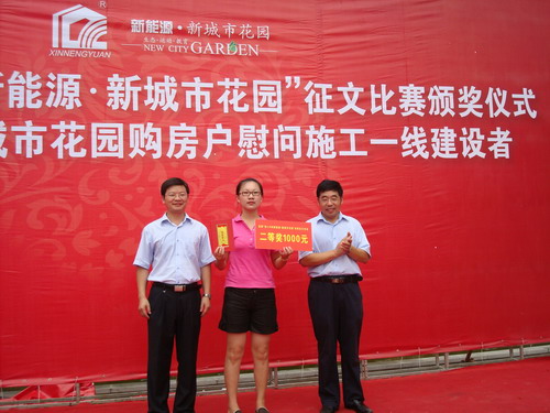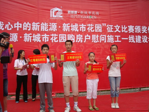 本次有獎?wù)魑幕顒?,吸引了全市社會各界的廣泛參與,一批又一批的學(xué)生、市民來到了新城市花園參觀,共收到來稿1000多篇。人們用飽蘸深情的筆墨,謳歌了新能源新城市花園的高品質(zhì)生態(tài)花園生活,儀式上業(yè)主們對為他們建造美好家園的施工一線建設(shè)者進(jìn)行了慰問。
