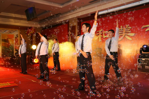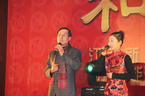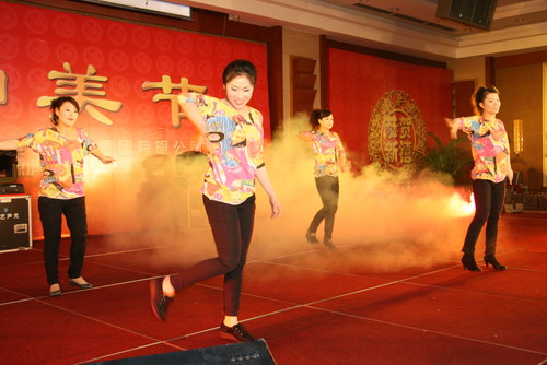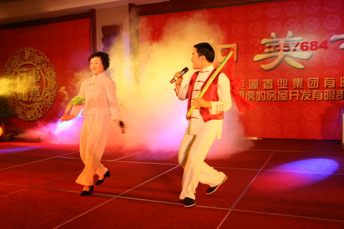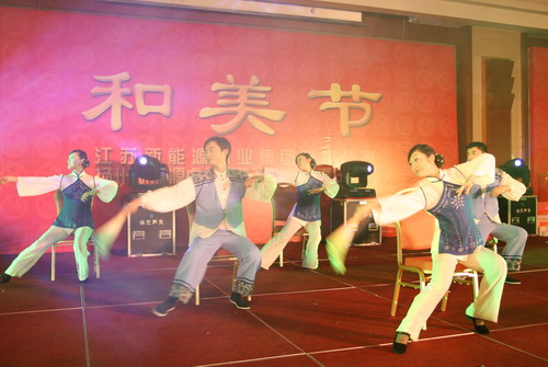 當(dāng)新能源集團(tuán)公司的四位美女和兩位帥哥表演的舞蹈《青花瓷》作為開場節(jié)目表演時,董事長包廣林驚奇地問:這些演員難道是我們的員工嗎?;節(jié)目真是形式多樣,一個比一個精彩。表演戲曲串燒的男員工唱的是有板有眼,女員工唱的是韻味十足,令人回味無窮;音樂小品《工地情緣》更是新能源人將緊張的工作原汁原味地搬上舞臺,展現(xiàn)了新能源人越是堅難困苦,越發(fā)豪情滿懷的精神面貌。表演花鼓戲《劉??抽浴返膬晌粏T工熱情洋溢、十分投入;演唱《卓瑪》的劉總身著藏族服裝,將潔白的哈達(dá)獻(xiàn)給了現(xiàn)場的嘉賓。泰興分公司的《動感單車》給人們留下了深刻的印象,五位身穿運(yùn)動服的員工騎著動感單車,時而左轉(zhuǎn),時而右轉(zhuǎn),時而爬坡,時而沖鋒,充分體現(xiàn)了我運(yùn)動,我健康,我快樂;的新能源開發(fā)理念;表演時裝秀《廣陵古韻》的新能源虎豹公司八位美麗的姑娘身著盛裝,腳踏貓步,婀娜多姿,面帶微笑,在她們的伴隨和引領(lǐng)下,公司的老總們也集體閃亮登場時,全場響起了一片熱烈的掌聲。物業(yè)公司的女聲獨(dú)唱《誰不說俺家鄉(xiāng)好》和《風(fēng)含情水含笑》抒發(fā)了新能源人對家鄉(xiāng)的熱愛之情,武術(shù)表演則用男性特有的陽剛之氣表達(dá)了新能源物業(yè)人為業(yè)主保衛(wèi)家園的勇氣和本領(lǐng)。充滿青春活力的舞蹈《青春勁舞》和表現(xiàn)異國情調(diào)的爵士舞熱情奔放,小合唱《北京歡迎你》和燭光舞《平安夜》親切甜美,使人賞心悅目。如果說男生群舞《開心寶》讓人的神經(jīng)高度興奮,使人開懷大笑的話,男女對唱《美麗的神話》則充分表達(dá)了新城市花園樓盤在泰興獨(dú)領(lǐng)風(fēng)騷的原因,那就是新能源堅定不移地走品牌之路,創(chuàng)精品工程的結(jié)果。