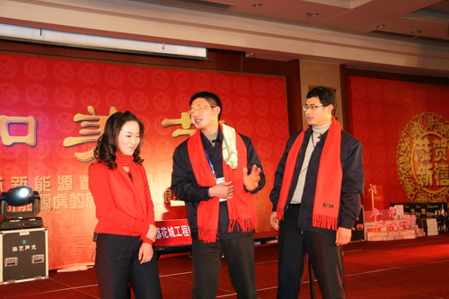 錦繡天邊掛,彩虹肩上披,引來吉祥鳥,寒冬報春暉。;新能源虎豹公司顧載兵總裁宣讀的頒獎辭不僅是對時裝秀的最好詮釋,而且是對新能源人迎接挑戰(zhàn),戰(zhàn)勝嚴(yán)冬心愿的最好表達(dá)。最后時裝秀、《開心寶》、《卓瑪》、武術(shù)表演等四個節(jié)目分別獲得最佳風(fēng)韻獎、最開心獎、最甜美歌聲獎和最佳功夫獎。 和美節(jié);為10家優(yōu)秀施工單位及供貨商代表頒了獎,還進(jìn)行了幸運(yùn)抽獎活動。2個小時的晚會始終洋溢著團(tuán)結(jié)、祥和、熱烈、歡樂的氣氛。