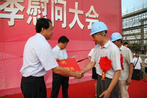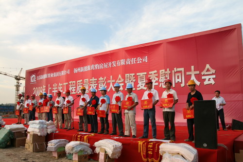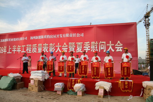 新能源;2009年上半年工程質(zhì)量表彰大會(huì)暨夏季慰問大會(huì)7月20日在陽光美第工地舉行,和美第、豪第坊、花樣年華3個(gè)項(xiàng)目的8個(gè)先進(jìn)單位、8 個(gè)先進(jìn)班組和30個(gè)先進(jìn)個(gè)人受到了表彰。同時(shí),江蘇新能源置業(yè)集團(tuán)有限公司和揚(yáng)州新能源虎豹房屋開發(fā)有限公司的負(fù)責(zé)同志向所有奮戰(zhàn)在新能源;工地的一線建設(shè)者發(fā)放了夏季慰問用品。23位業(yè)主在大會(huì)現(xiàn)場(chǎng)受聘擔(dān)任陽光美第兼職監(jiān)理員,并接受了新能源虎豹公司頒發(fā)的聘書。