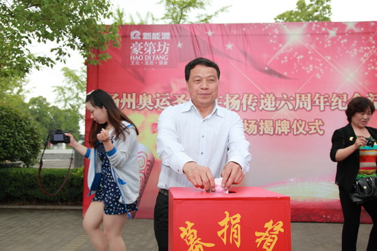 5月26日是北京奧運(yùn)圣火在揚(yáng)傳遞六周年紀(jì)念日。5月25日上午,中國(guó)火炬手聯(lián)合會(huì)執(zhí)行主席、中國(guó)奧運(yùn)火炬手協(xié)會(huì)理事長(zhǎng)黃海軍等領(lǐng)導(dǎo)專程從北京來揚(yáng),與揚(yáng)州部分奧運(yùn)火炬手聚會(huì),并為坐落在新能源豪第坊的火炬廣場(chǎng)揭牌。在活動(dòng)現(xiàn)場(chǎng),部分火炬手還當(dāng)場(chǎng)捐款,為火炬廣場(chǎng)體育設(shè)施建設(shè)添一把柴。為助力北京申辦2022年冬奧會(huì),火炬手們還在條幅上簽名,表達(dá)揚(yáng)州火炬手的心聲。