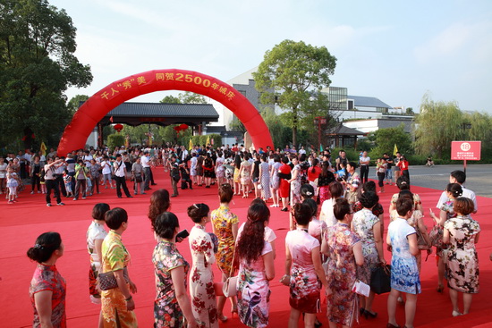 8月22日下午4點半,在豪第坊小區(qū)入口大道上,1100名來自揚州市區(qū)和各縣市、南京、常州等地的美女,組成40余個方陣,身著各色旗袍,在紅毯上款款而行,歷時近50分鐘,場面震撼。這就是揚州2500年城慶系列活動之千人秀;美賀城慶。