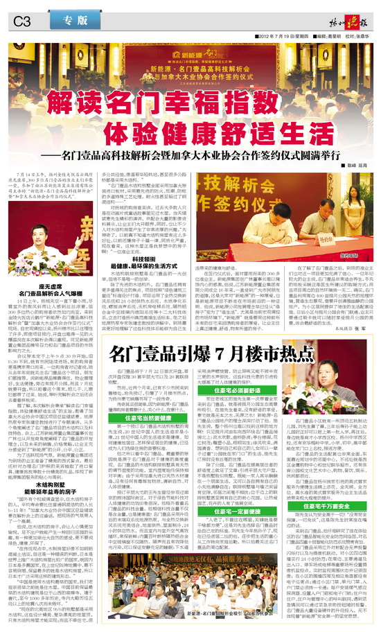7月14日上午,揚州金陵大飯店云鶴廳座無虛席,300多位名門壹品的準業(yè)主們齊聚一堂,參加了由江蘇新能源置業(yè)集團有限公司主辦的新能源名門壹品高科技解析會;暨加拿大木業(yè)協(xié)會合作簽約儀式;。
